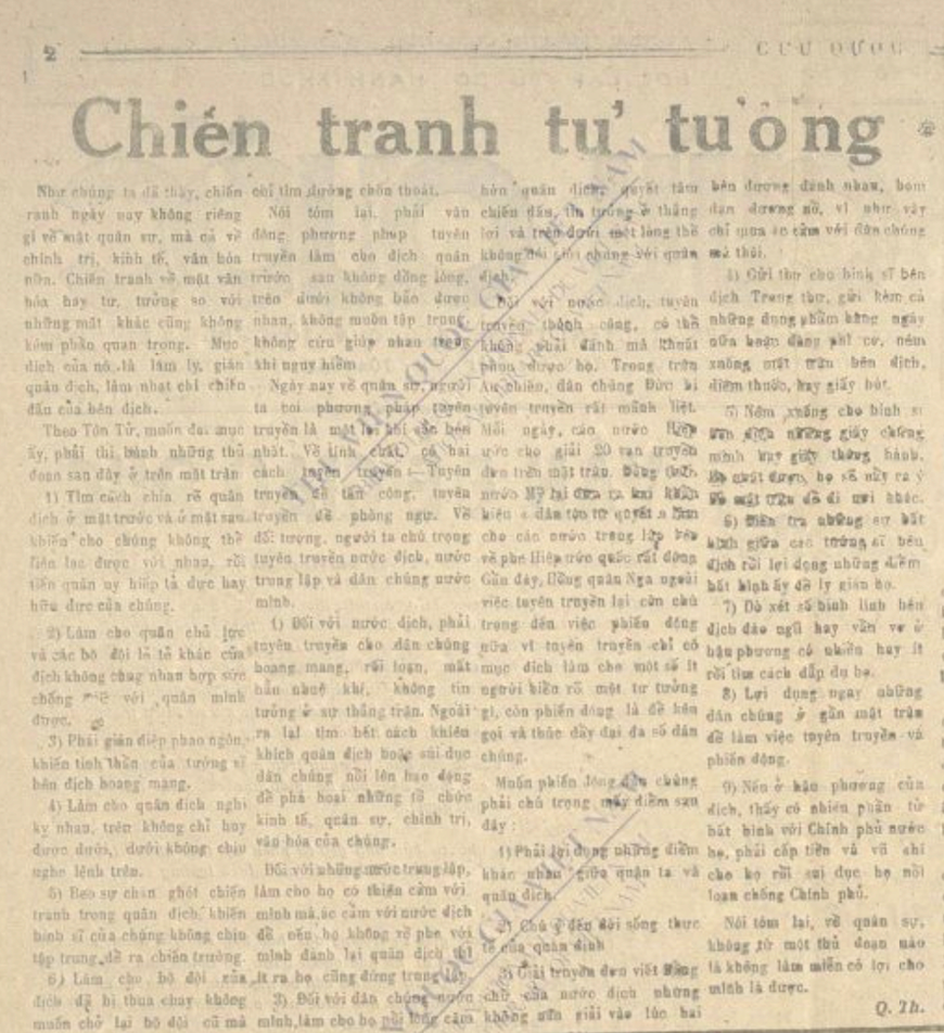 Ngày 11-10-1946, Báo Cứu quốc số 372 tiếp tục công bố loạt bài về “Binh pháp Tôn Tử” của Chủ tịch Hồ Chí Minh với nhan đề “Chiến tranh tư tưởng”. Trong bài, Người chỉ rõ: “Chiến tranh ngày nay không riêng gì về mặt quân sự, mà cả về chính trị, kinh tế, văn hóa nữa. Chiến tranh về mặt văn hóa hay tư tưởng so với những mặt khác cũng không kém quan trọng…”.